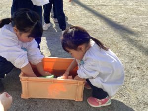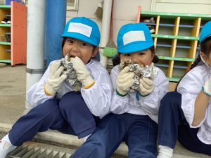 幼稚園で育てた、大きな大きなサツマイモを、もみ殻で焼く本格焼き芋で食べました。