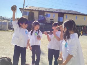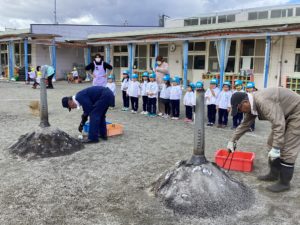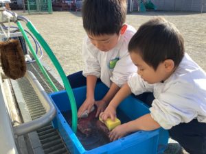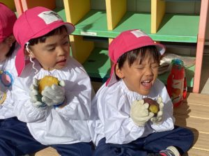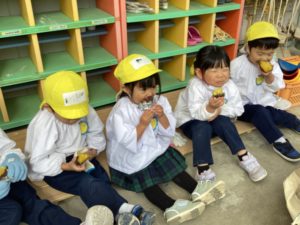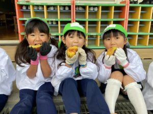 幼稚園で育てた、大きな大きなサツマイモを、もみ殻で焼く本格焼き芋で食べました。
