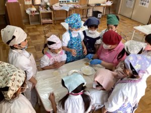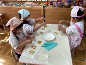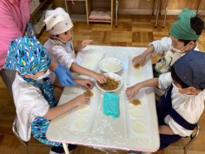 年中組が、餃子の皮を使ったアップルパイを作りました。