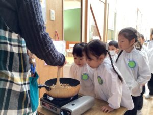 朝から、大豆を炒って準備します。良い匂いが園内に広がります。