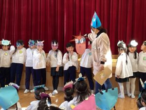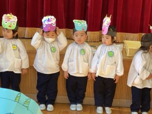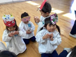 自分の作った鬼のお面をかぶり、ホールへ集合。