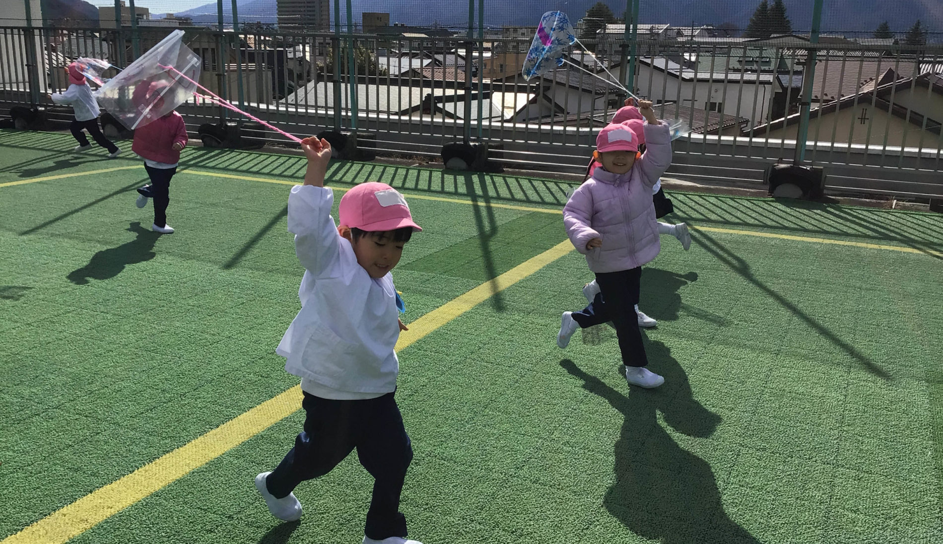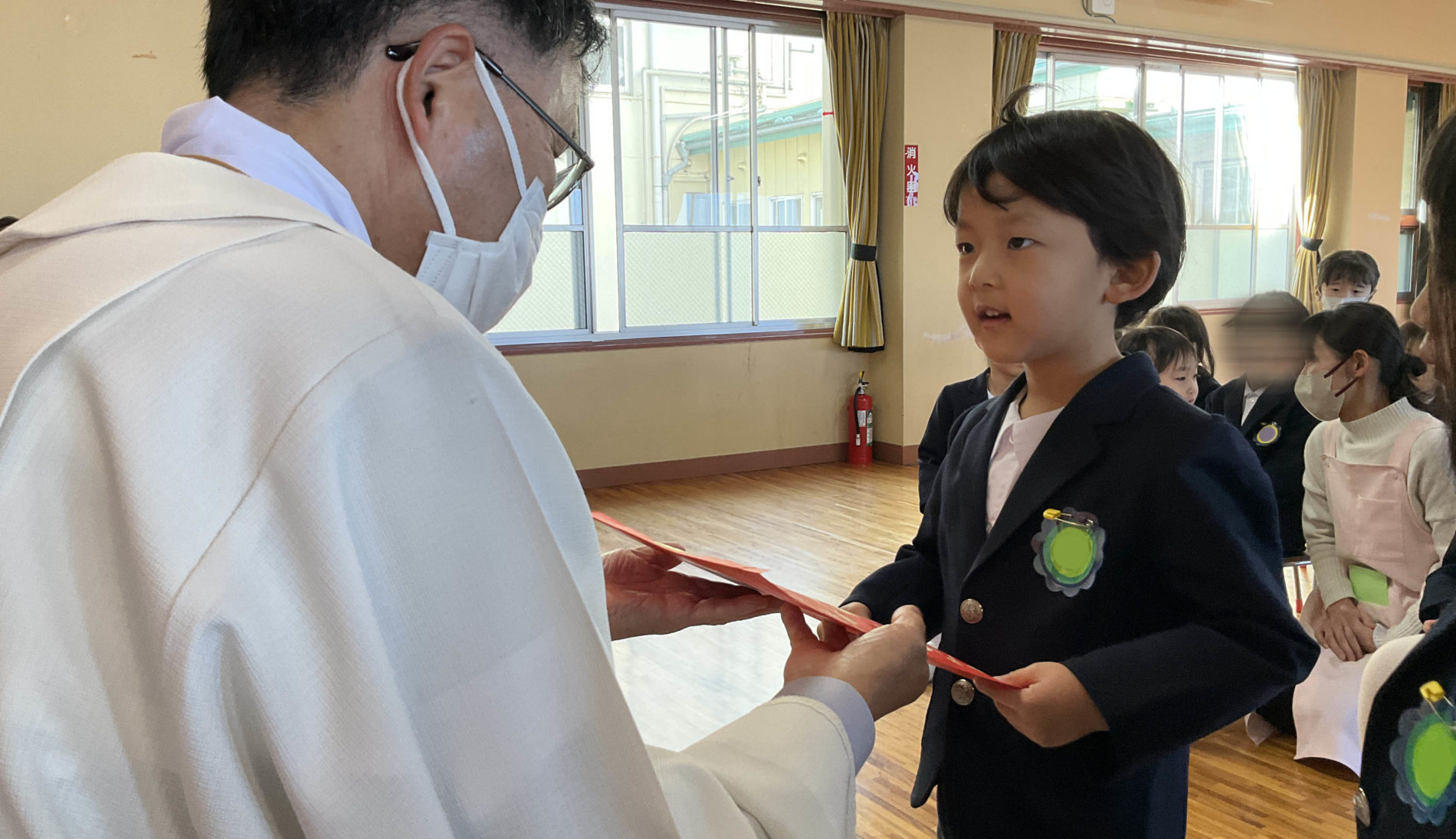 子供たちは、徒歩や幼稚園バスで元気に登園。マリアさまにお祈りし、一日が始まります。