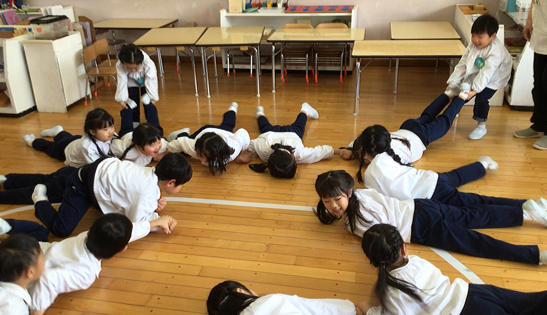 年間指導計画の中には学年別の横割り保育も設定し、同年齢の友達との関わりの中で、発達に合った活動(運動、知性、精神面の発達)も保障していけるように心がけています。