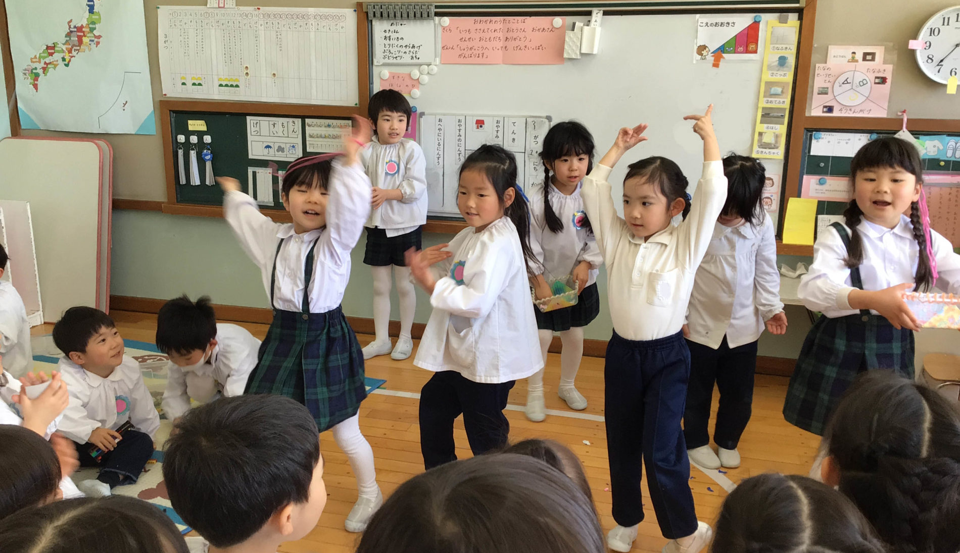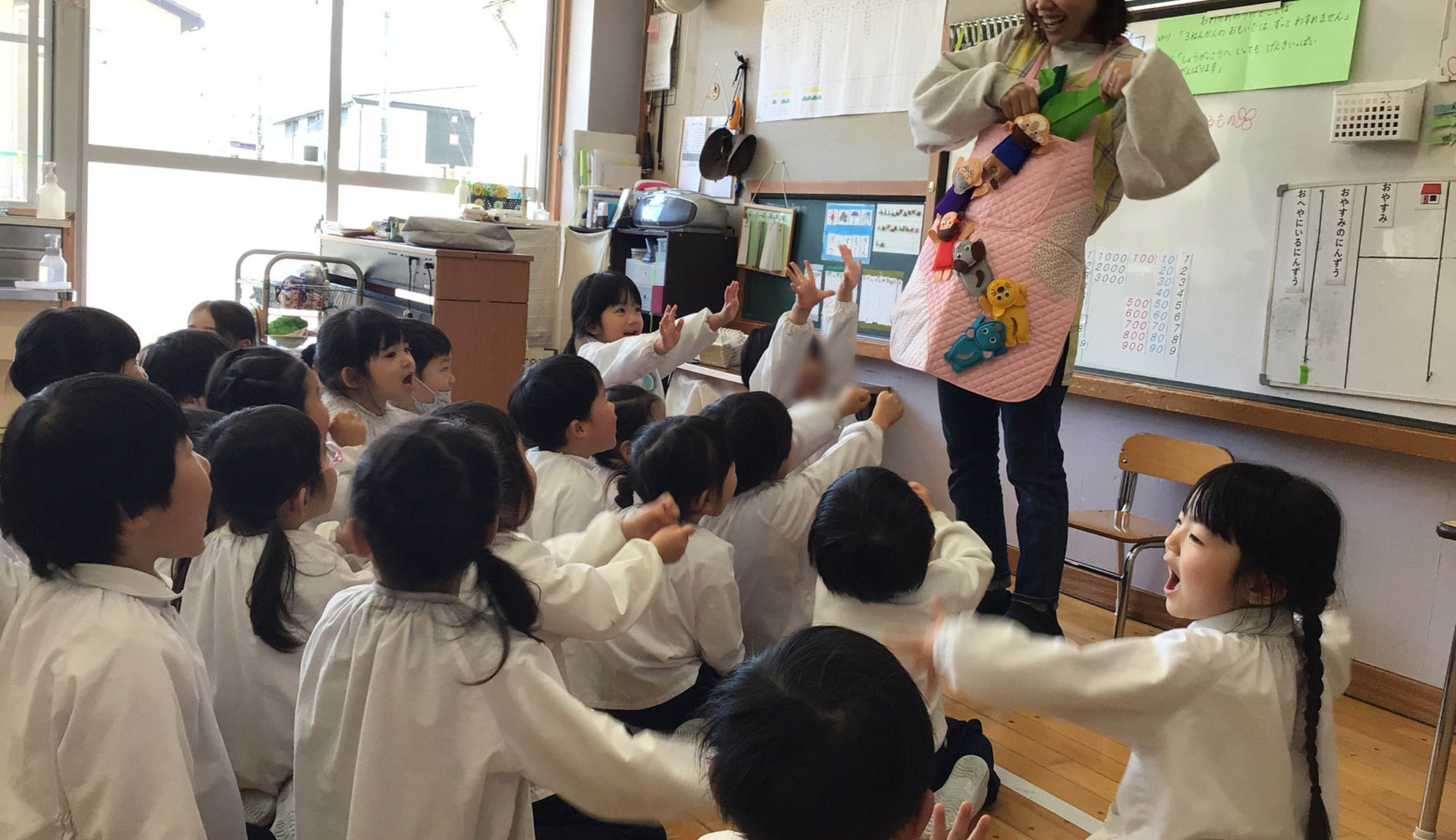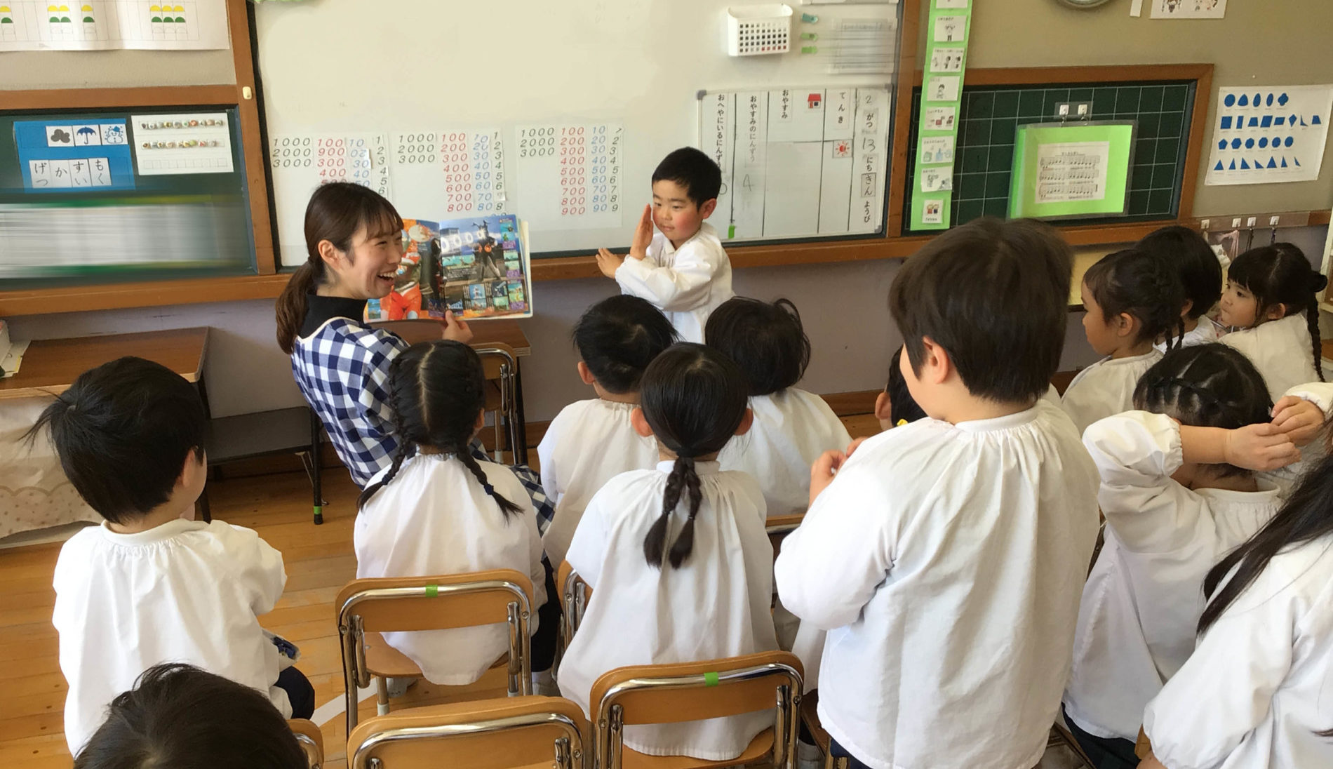 一日の予定を確認した後は、歌やお遊戯、絵本などを楽しみます。